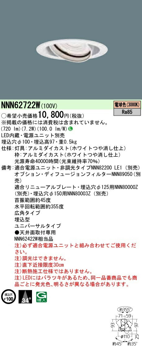 【最安値挑戦中!最大20倍】パナソニック NNN62722W ユニバーサルダウンライト 電源ユニット別売 天井埋込 LED(電球色) 埋込穴φ100 LED100形 ホワイト [∽]